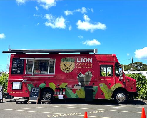 2023年の春頃からカカアコファーマーズマーケットの地がとっても熱い!! とっても広いデッキが設置されて、何台かのフードトラックがあります。 その入り口に、この夏「ライオンコーヒー」のカフェトラックがお目見えしました!! これは嬉しい 左の窓口で…